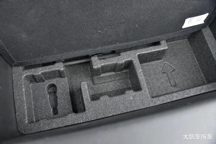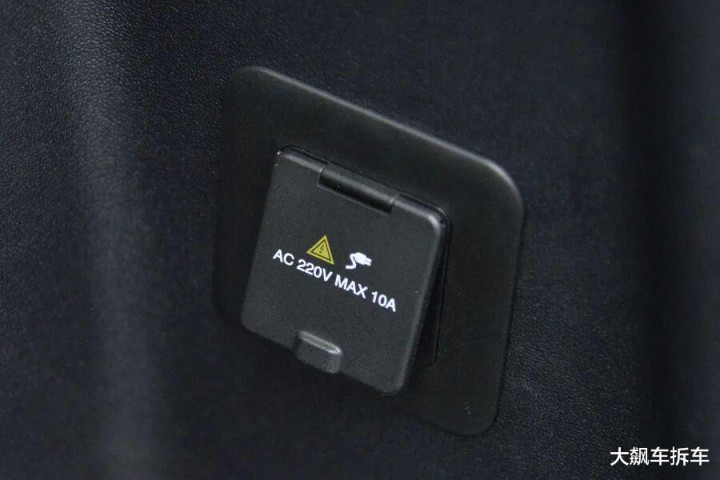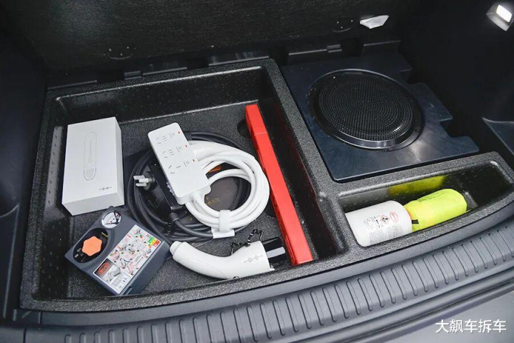 后备厢地板下方还有额外的储物空间,里面有补胎液和充气泵,还有一个2200千瓦对外放电的插口。