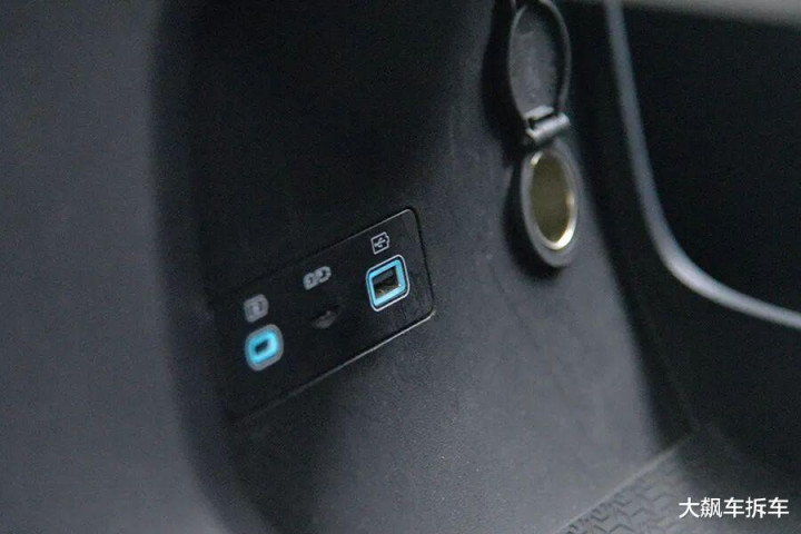 控制台下方是另外一个储物空间,配有USB、Type-C、12V电源口和一个TF卡插槽。