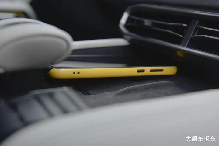 这辆车有两个手机槽,其中一个支持50瓦无线快充。但手机槽的长度有些短,一些大尺寸手机无法放进去,尤其是带着手机壳,更是困难。