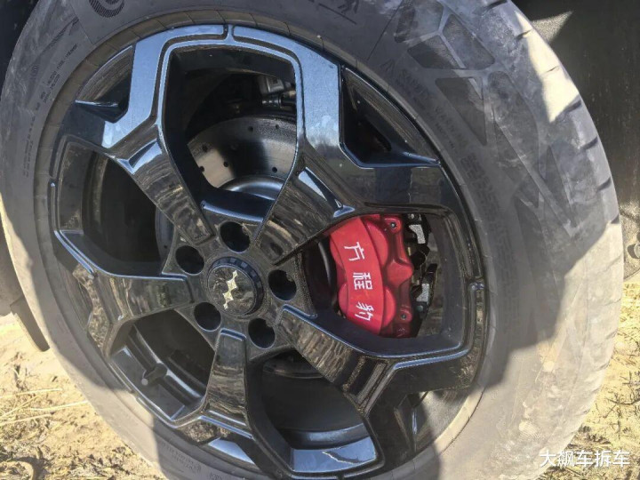 前轮刹车片采用打孔通风盘,红色卡钳上印有“方程豹”三个大字。