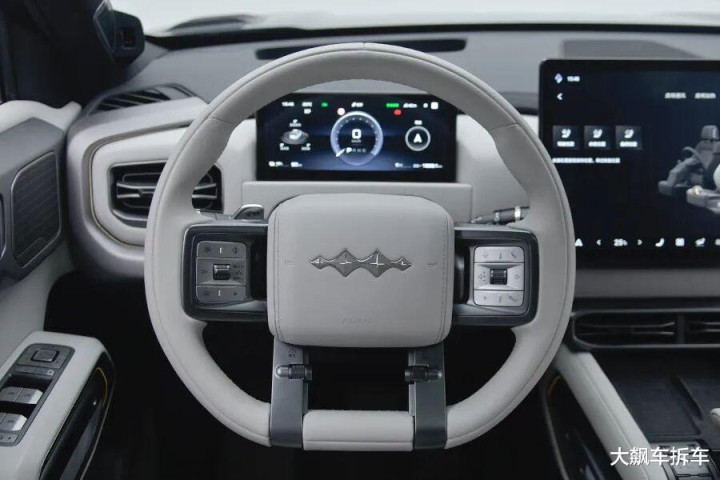 两侧控制多媒体和仪表显示,下方是调节驾驶模式和地形模式的旋钮。