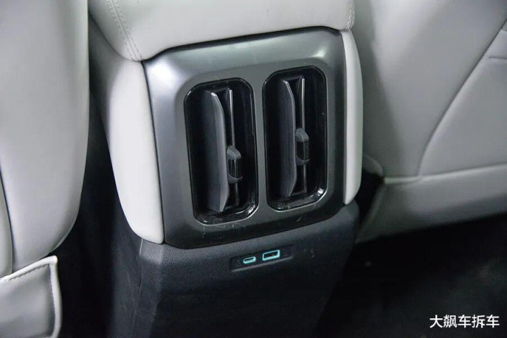 这辆车轴距为2745毫米,后排空间够用,地板纯平,脚下比较舒适。后排有独立的空调出风口以及充电口。