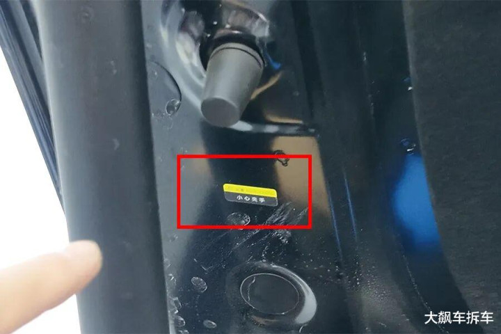 虽然在电动撑杆附近贴有“小心夹手”的警告标识,但标签实在是太小了,很难观察到!所以建议工程师借鉴一下小米YU7的做法,能起到更好的警示作用!